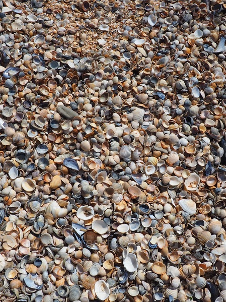 Раковины брюхоногих двустворчатых моллюсков, обитающих в Азовском и Черном морях, Голубицкая. Бежевые, черные, белые ракушки на берегу. Cerastoderma lamarcki, Hypanis colorata, Anadara inaequivalvis