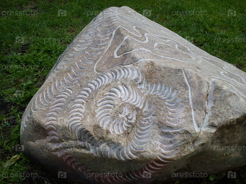 Большой булыжник в парке. Плавные волнистые линии с тиснением под камень. Наскального искусства
