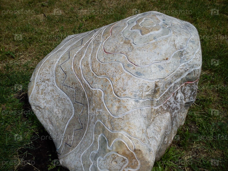 Большой булыжник в парке. Плавные волнистые линии с тиснением под камень. Наскального искусства