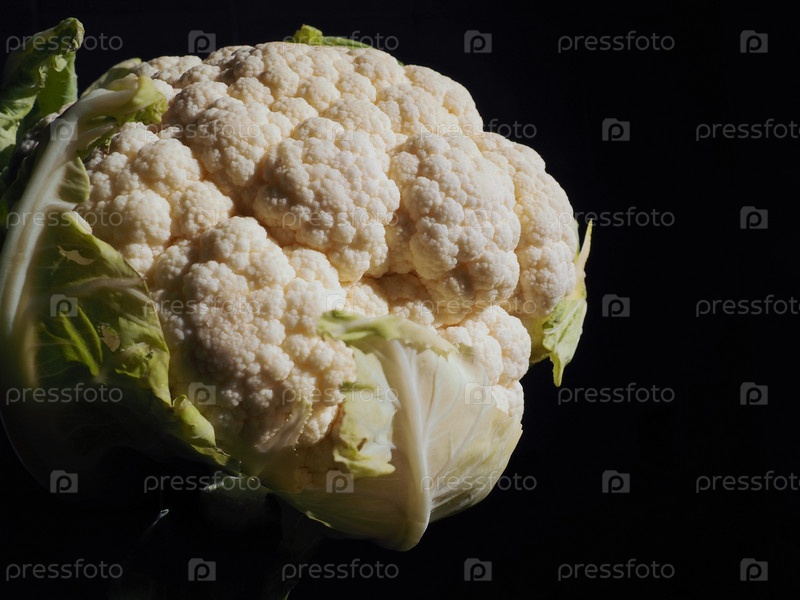 Крупный план цветной капусты на черном фоне. Боковое освещение. Свежая кочанка. Зеленые овощи. Brassica oleracea из рода Brassica семейства Brassicaceae. Здоровое питание и вегетарианство