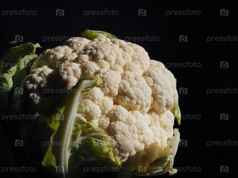 Крупный план цветной капусты на черном фоне. Боковое освещение. Свежая кочанка. Зеленые овощи. Brassica oleracea из рода Brassica семейства Brassicaceae. Здоровое питание и вегетарианство