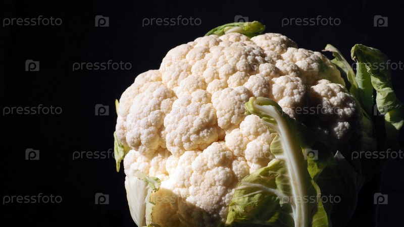 Крупный план цветной капусты на черном фоне. Боковое освещение. Свежая кочанка. Зеленые овощи. Brassica oleracea из рода Brassica семейства Brassicaceae. Здоровое питание и вегетарианство