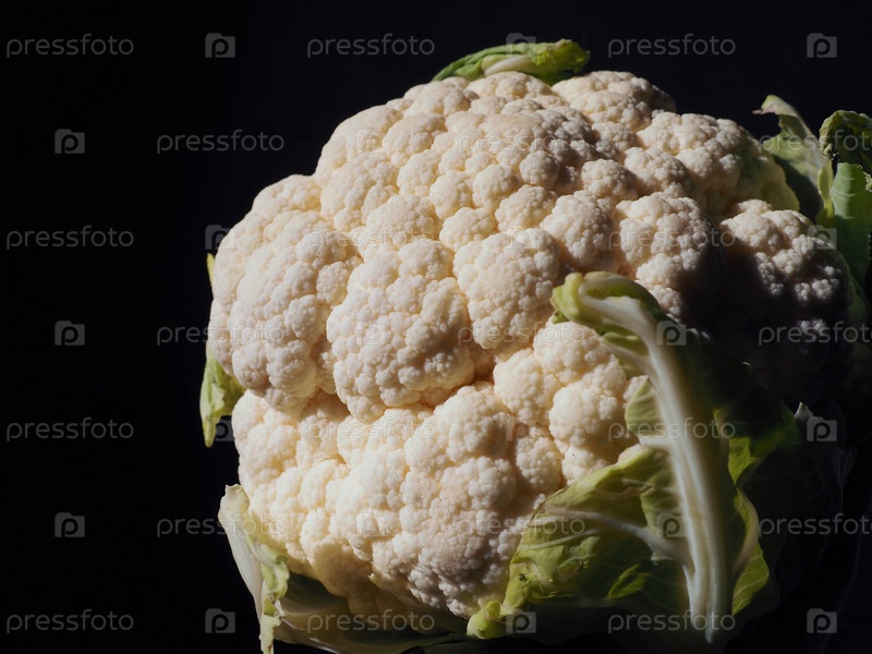 Крупный план цветной капусты на черном фоне. Боковое освещение. Свежая кочанка. Зеленые овощи. Brassica oleracea из рода Brassica семейства Brassicaceae. Здоровое питание и вегетарианство