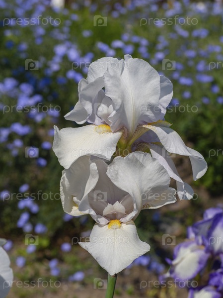 Изысканный нежный белый цветок ириса на фоне цветущей клумбы. Крупный план цветка ириса в саду