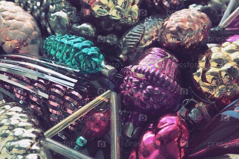 Новогодние и елочные игрушки, стеклянные шары в виде шишек и корзинок. Шишки и подвески из блестящей мишуры. Праздничный фон. Много новогодних украшений. Ретро винтажный стиль