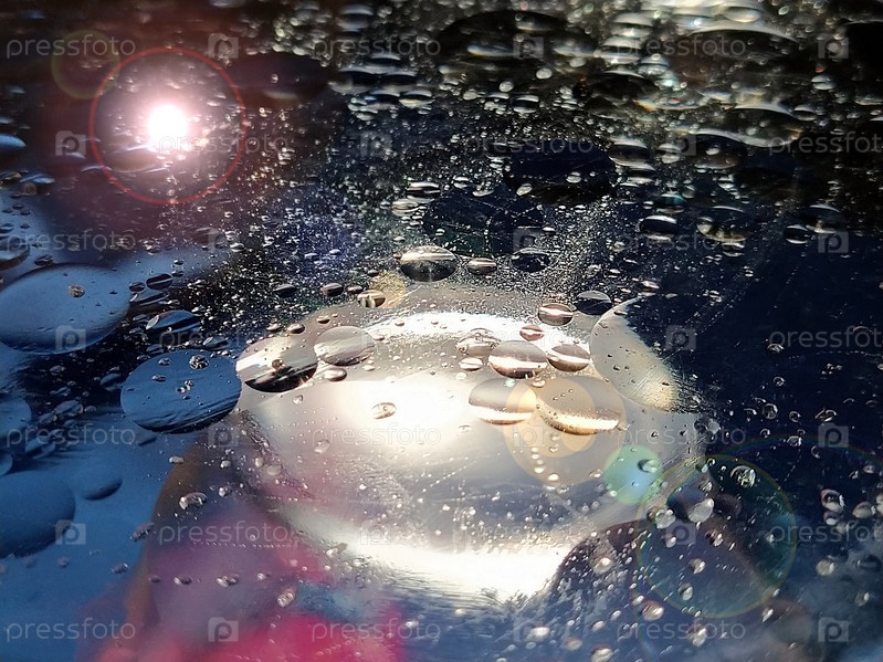 Круглые капли разного размера. Капли масла в воде с цветным отражением. Синие, белые и черные элементы. Круги и сферы. Микроабстракция. Блики в воде. Имитация солнца
