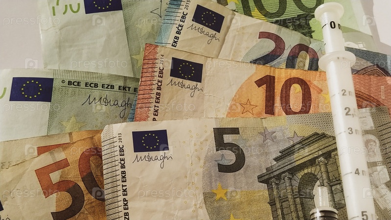 Бумажные банкноты евро. Европейская валюта на белом фоне крупным планом. Измерительный шприц рядом с деньгами. Высокая стоимость лечения. Банкноты номиналом 5, 10, 20, 50 и 100 евро