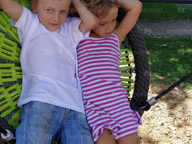 Дети качаются на качелях из паутины. Мальчик и девочка, брат и сестра летом на детской площадке. Качание качелей. Мальчик 8 лет в белой футболке. Девочка 6 лет в полосатом розовом платье
