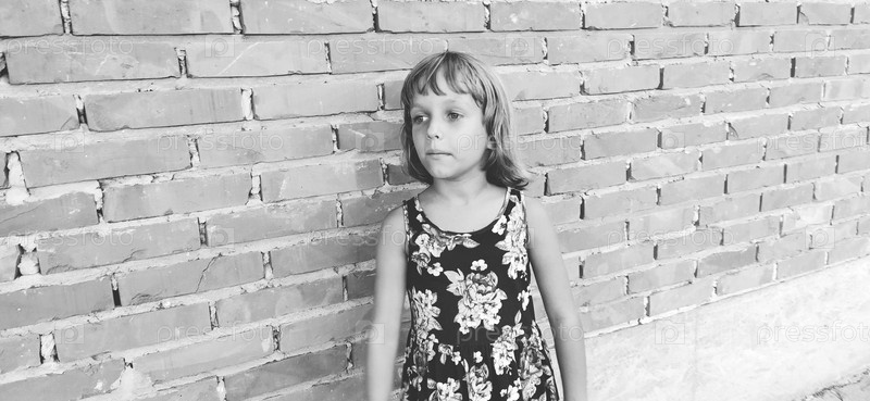Черно-белый портрет красивой молодой девушки в городе на открытом воздухе, женщина на фоне кирпичной стены. Винтажная стильная девушка