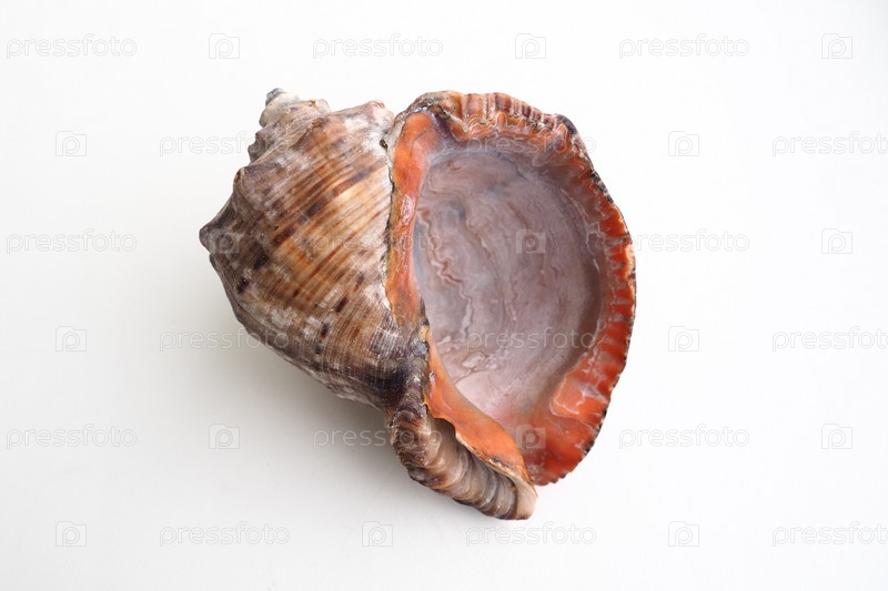 Рапана, род хищных морских переднежабревых брюхоногих моллюсков из семейства Muricidae.Рак широкоовальный, серо-коричневого цвета со спиральными ребрами и осевыми утолщениями.Пустой раковина на белом фоне
