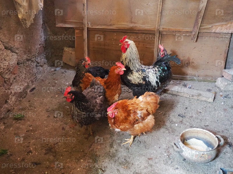 Курица в сарае. Куры и петухи в деревенской обстановке. Бурые пестрые птицы с красными гривами на головах. Сельский сарай