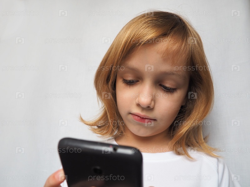 7-летняя девочка со светлыми волосами смотрит на смартфон, телефон или планшет. Ребенок в белой одежде на сером фоне. Концепция развития технологий и телекоммуникаций