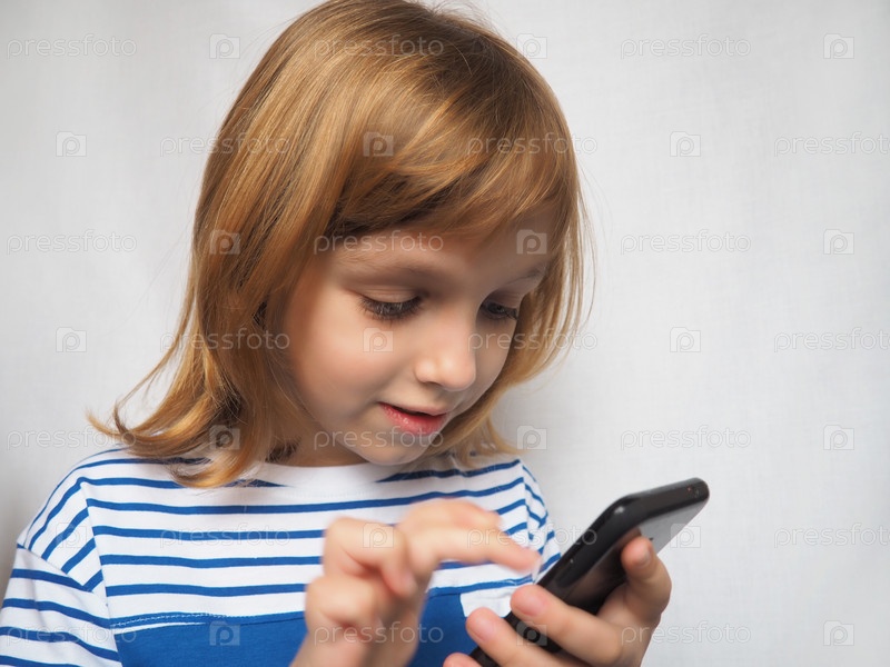 Маленькая девочка с мобильным телефоном в руках. Студийный снимок. Девушка тычет пальцем в смартфон и улыбается. Ребенок со светлыми волосами