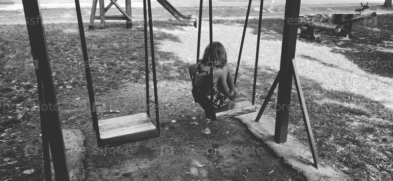 Маленькая девочка на качелях. Девушка грустит одна на детской площадке. Монохромное черно-белое изображение. Концепция одиночества и забывчивости