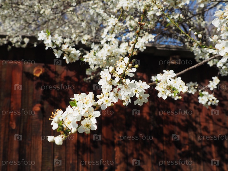 Дерево, цветущее белыми цветами. Вишня, яблоня, слива или черешня в цветущем состоянии. Нежные белые лепестки. Открытка. Поздравляю с днем весны, с днем матери. Деревянная стена