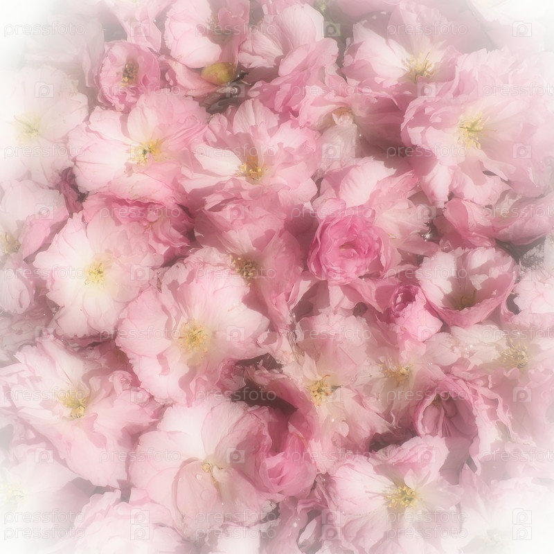 Розовые цветы вишни сакуры фон. Цветочная стена. Мягкий выборочный фокус. Праздничная открытка. Розовые лепестки и желтые тычинки. Красивый фон. Белая виньетка. Размытое искусство. Весенний вишневый цвет