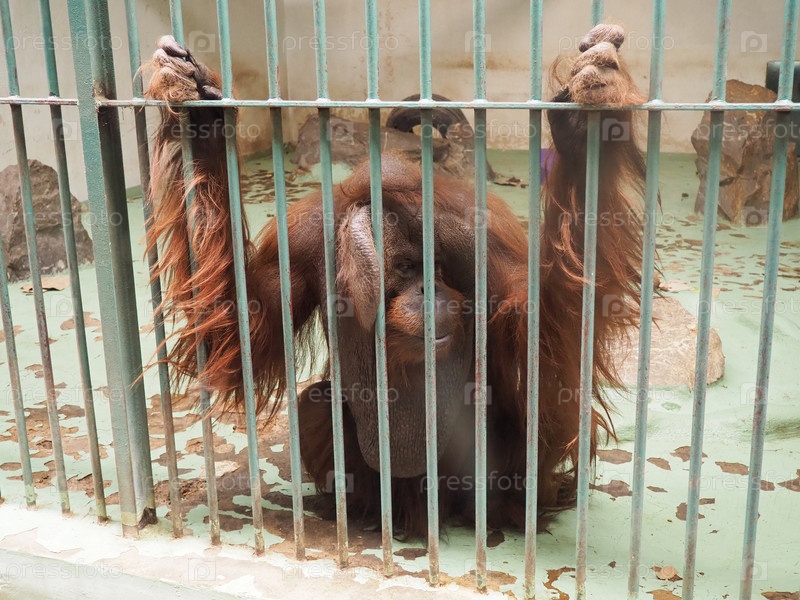 Очень грустный орангутанг за решеткой. Обезьяна с рыжими волосами сидит и тоскует. Орангутаны, орангутанг — лесной человек, понго — род древесных обезьян, один из самых близких к человеку по гомологии ДНК