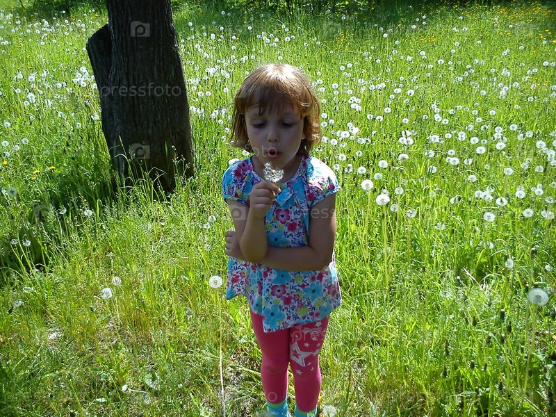 Девушка дует на белые пушистые семена одуванчика. Летом ребенок гуляет по зеленой лужайке. Малышка надула щечки, семена одуванчика разлетаются в разные стороны