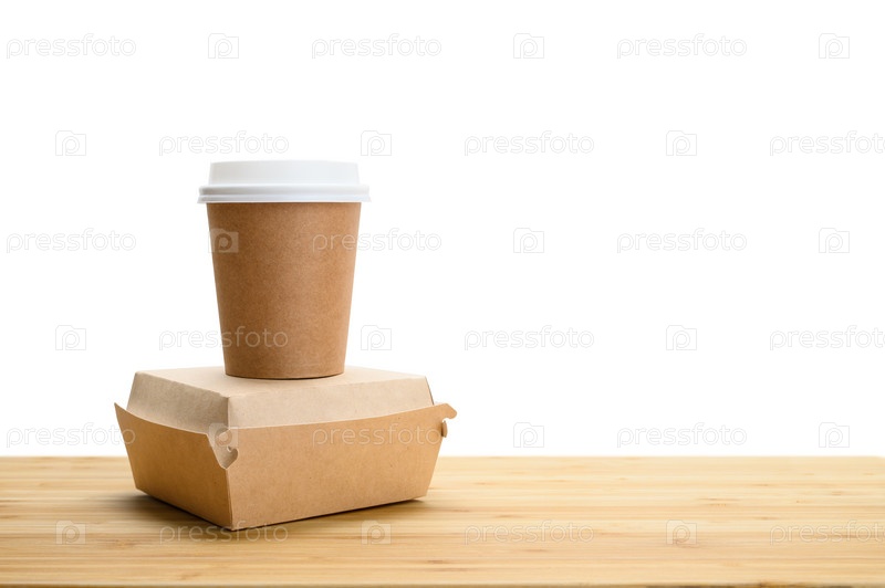 Бумажный стаканчик для кофе и контейнер с гамбургером на деревянном столе на белом изолированном фоне. копировать пространство