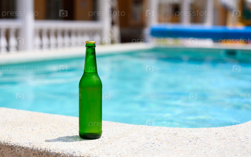 Бутылка холодного пива у бассейна в отеле в жаркий день. копирайт
