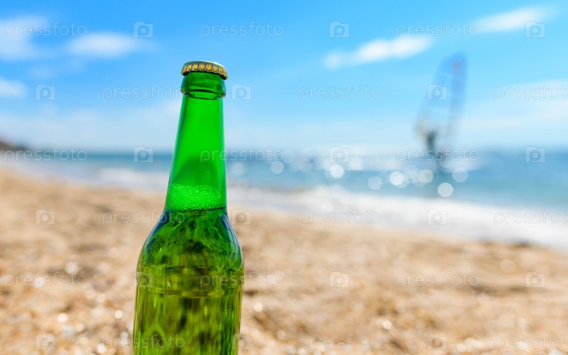 Бутылка пива крупным планом на берегу моря. Концепция отпуска