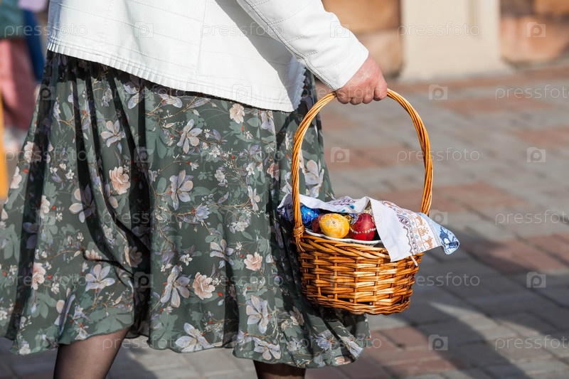 Россия, г. Видное, 15 апреля 2023 г. Пасхальная служба. Священник окропляет людей и угощает Пасху святой водой при входе в храм. Люди идут освящать яйца и лепешки