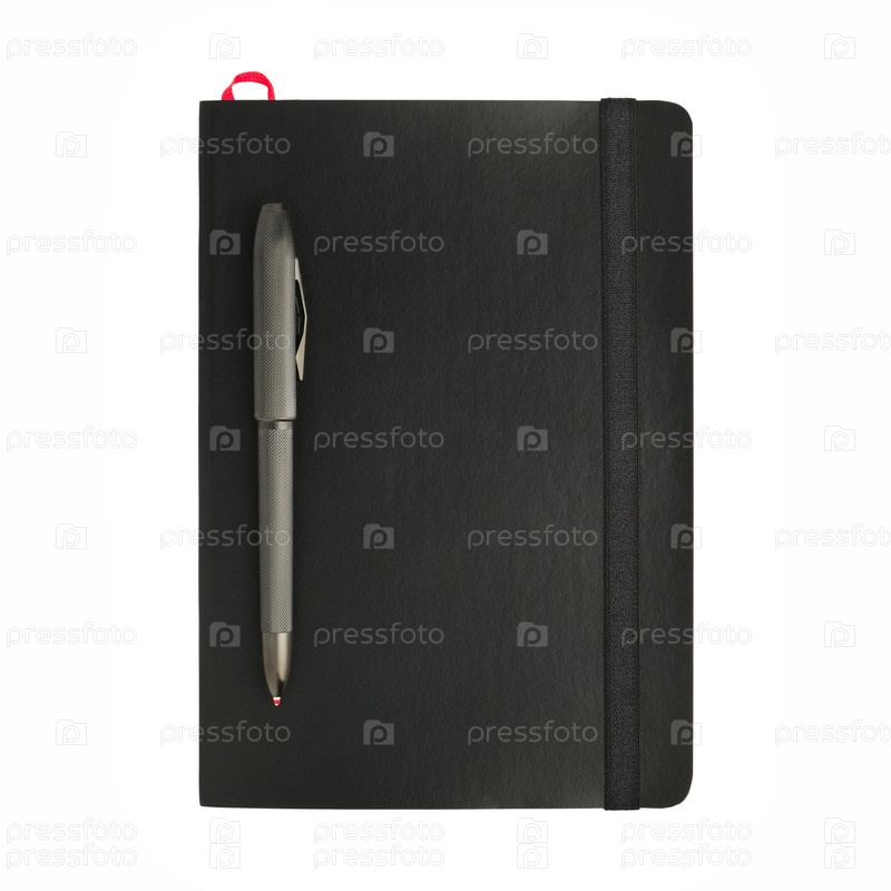 Черный деловой дневник и шикарная шариковая ручка на белом фоне
