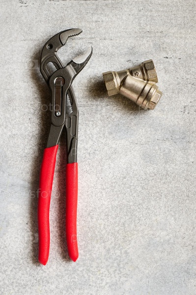 Регулируемые плоскогубцы на сером бетонном фоне крупным планом, вид сверху