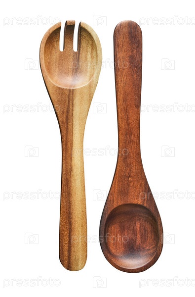 Деревянные ложки для салата лежат рядом с круглой разделочной доской, кухня у