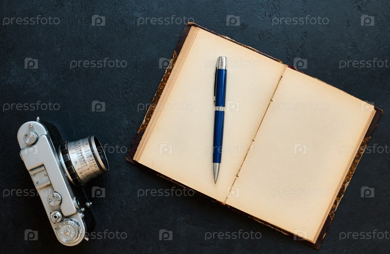 Старая открытая книга с пустыми страницами и винтажной камерой на темном фоне, вид сверху, плоская планировка