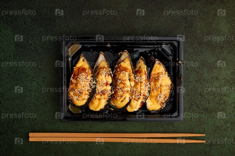 Запеченные мидии с сыром и кунжутом в ракушках на темно-зеленом текстурированном фоне, вид сверху, морепродукты