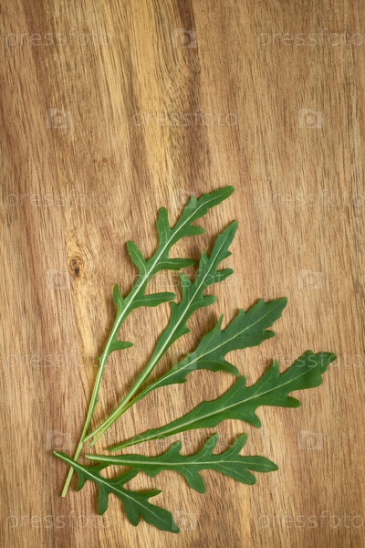 Листья рукколы на деревянном фоне крупным планом