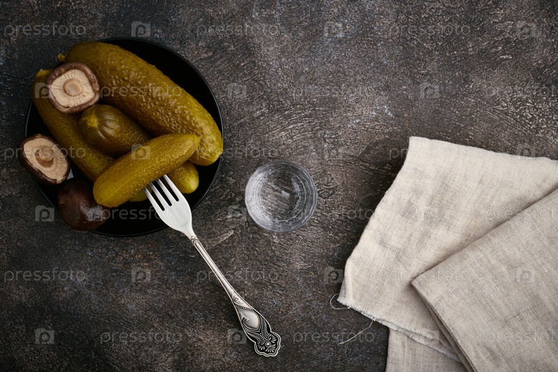 Стопка водки, соленых огурцов и грибов на блюдце, вид сверху, крупный план