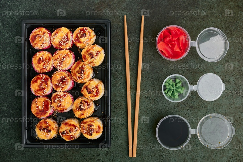 Запеченные рулетики из лосося и угря в пластиковом лотке на вынос, банки с имбирем, васаби и соевым соусом, восточная кухня
