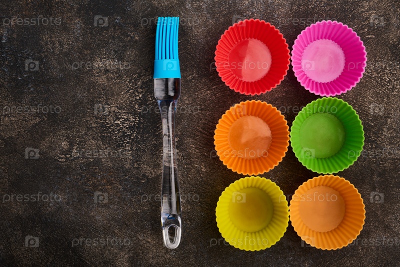 Приготовление силиконовой кисти и силиконовых форм для кексов, крупным планом, на темном фоне