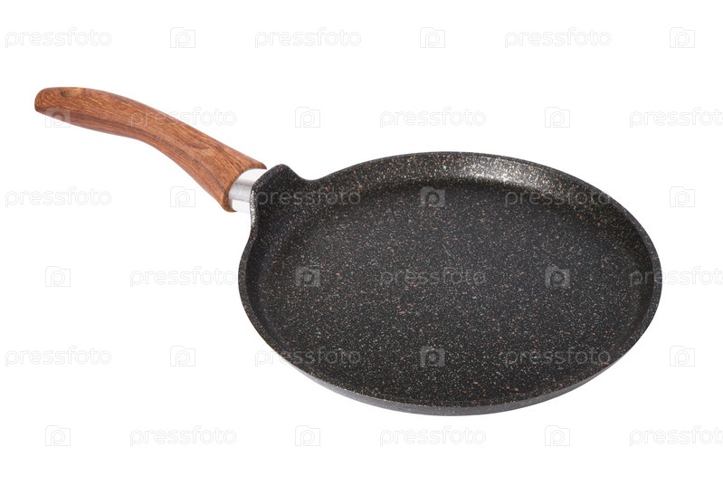 Пустая антипригарная сковорода с ручкой для выпечки блинов, изолированная на белом, малая глубина резкости