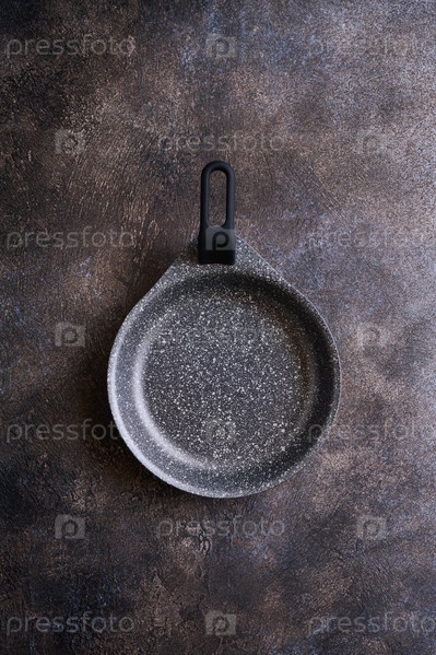 Пустая сковорода с антипригарным покрытием на темном текстурированном фоне, крупный план, вид сверху