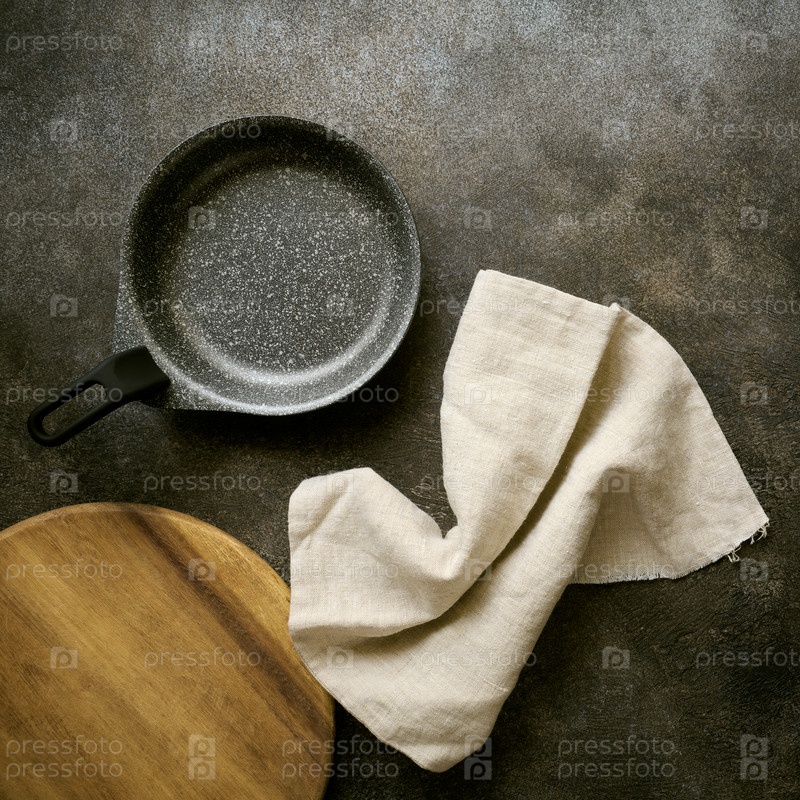 Пустая сковорода, разделочная доска и льняная салфетка, вид сверху, крупный план