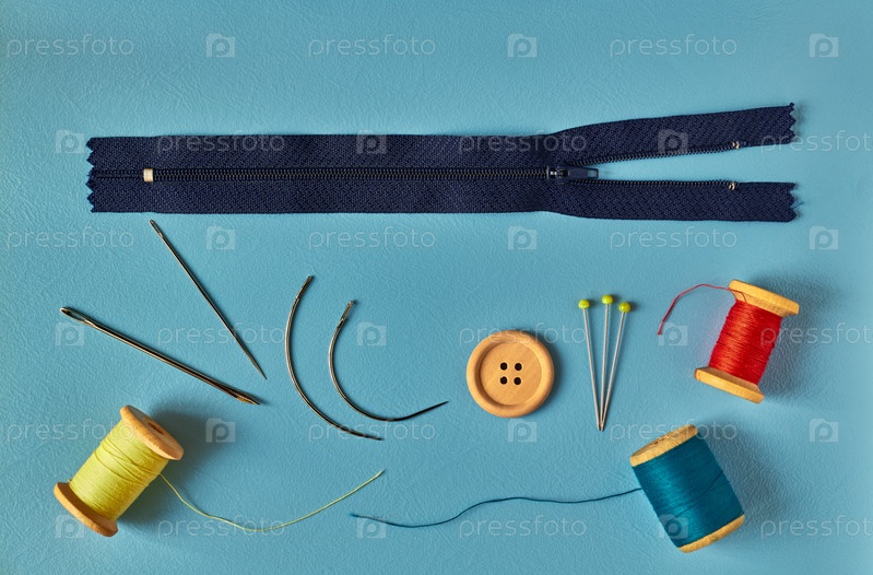 Швейные принадлежности - иглы, нитки, булавки и молния на синем фоне