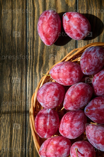 Сочные спелые сливы в плетеной корзине на деревянном столе, вид сверху