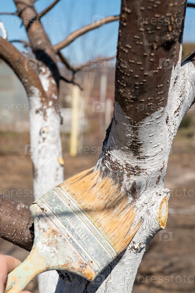 Покраска деревьев известью от насекомых в загородном саду. Побелка весенних деревьев, защита от вредителей