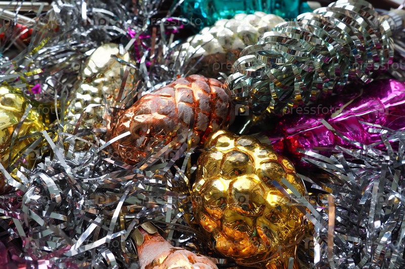 Новогодние и рождественские украшения, мишура, горжетки, елочные игрушки. Разноцветные шарики в виде конусов и корзинок. Праздничное оформление интерьера. Новогодняя или рождественская композиция