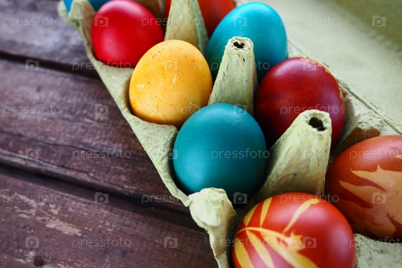 Разноцветные яйца, расписанные гуашью и луковой шелухой в картонной коробке на фоне деревянного стола. Десять вареных яиц. Плакат-открытка к Пасхе. Пасха. Красные, синие, желтые, коричневые яйца