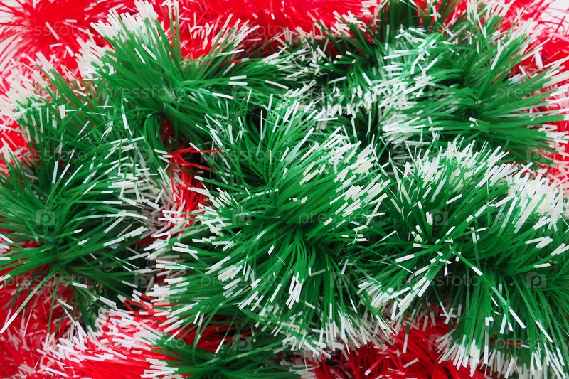 Новогодние и рождественские украшения, красные и зеленые горжетки для елки. Двухцветные рождественские гирлянды-дождь смешаны. Праздничный декор