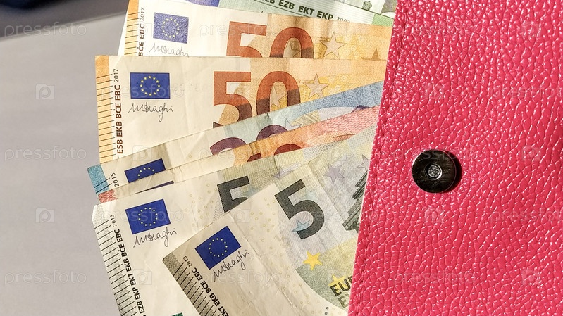 Бумажные банкноты евро. Европейская валюта на белом фоне крупным планом. Кошелек или портмоне ярко-розового цвета с металлической кнопкой, из которой выкладываются деньги. Банкноты 5, 10, 20, 50 и 100