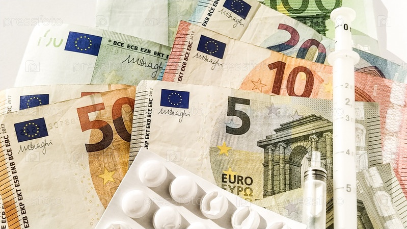 Бумажные банкноты евро. Европейская валюта на белом фоне крупным планом. Белая упаковка с таблетками и мерный шприц рядом с деньгами. Высокая стоимость лечения. Банкноты 5, 10, 20, 50, 100 евро