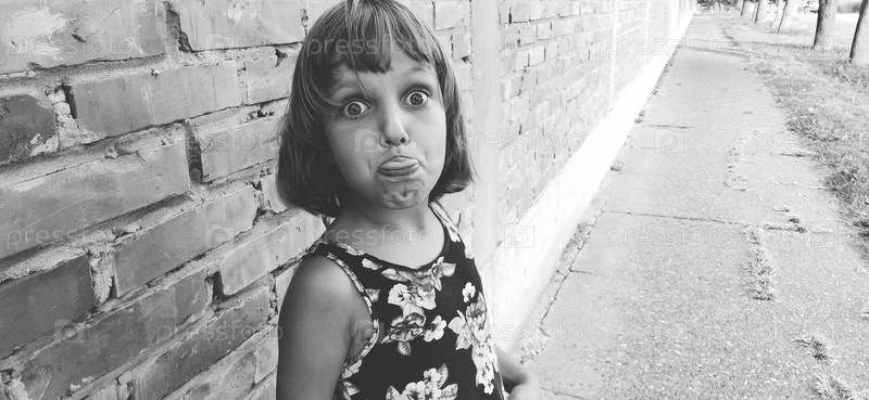 Сумасшедшая девчонка таращит глаза, высовывает язык и корчит рожи. Черно-белая монохромная фотография. Эмоции ребенка в общении. На заднем плане дорога и кирпичная стена