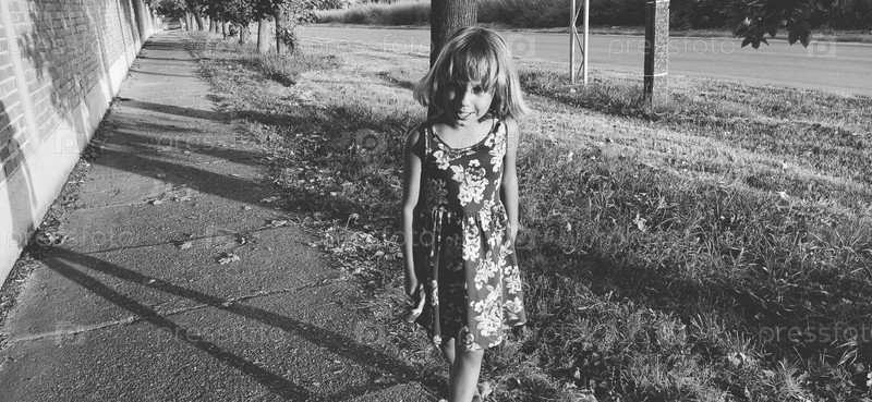 Девушка идет по дороге, размахивая руками. Черно-белое монохромное изображение. Оформлен в стиле ретро или винтаж. Ребенок на фоне кирпичной стены. Вечернее время. Девушка корчит рожи