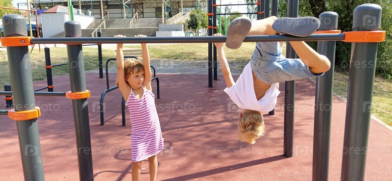 Сремска-Митровица, Сербия, 13 сентября 2020 г. Мальчик и девочка на спортивной или игровой площадке занимаются физическими упражнениями. Ребенок в белой футболке. Девушка в полосатом платье смеется