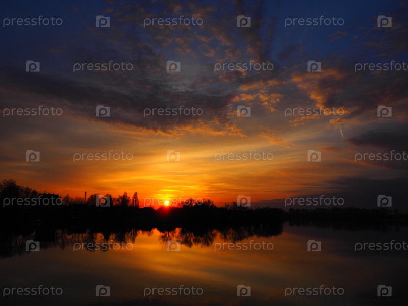 Очень красивый закат над водой. Берег реки и горизонт. Яркие облака нарисованы закатившимся за горизонт вечерним солнцем. Красные, оранжевые, голубые драматические облака неба. Размытый туманный фокус